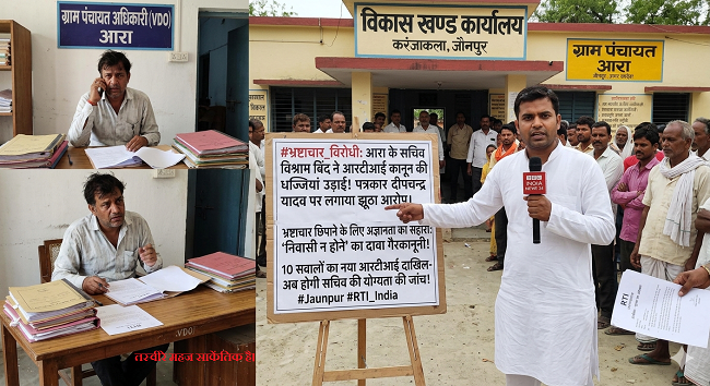 जौनपुर (करंजाकला): उत्तर प्रदेश के जौनपुर जनपद अंतर्गत विकास खंड करंजाकला की ग्राम पंचायत ‘आरा’ इन दिनों भ्रष्टाचार और प्रशासनिक तानाशाही के चलते सुर्खियों में है। यहाँ तैनात ग्राम पंचायत अधिकारी (VDO) विश्राम बिंद पर आरटीआई (सूचना का अधिकार) कानून का गला घोंटने और सूचना मांगने वाले पर अनर्गल आरोप लगाने के गंभीर आरोप लगे हैं।